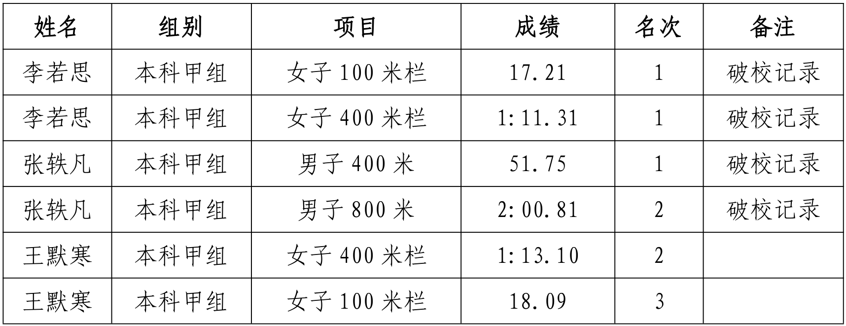 经过5天的激烈角逐,我校7名运动员与来自全省120所高校代表团的1893名运动员同场竞技,最终斩获3枚金牌、2枚银牌、1枚铜牌,获女子团体第七名,团体总分第九名的好成绩,康峰被授予“优秀教练员”称号,张轶凡、王珂欣被评为“体育道德风尚运动员”,我校代表队获得“体育道德风尚奖”。值得一提的是,我校代表队在本次运动会4个项目的成绩同时也打破了我校该项目的保持记录,其中张轶凡同学男子800米的成绩同时打破了我校保持32年之久的校记录。